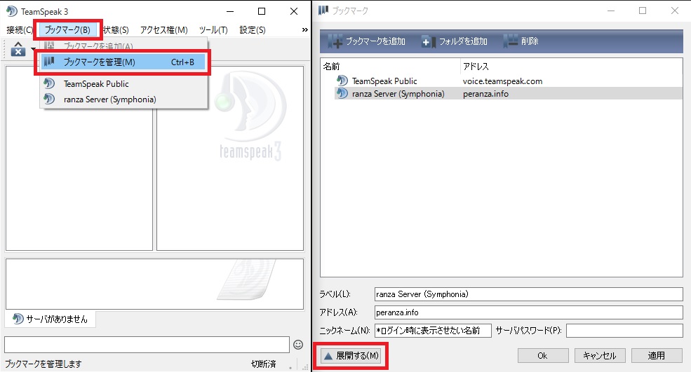 ①Symphoniaチャンネルに接続する。 ②ブックマーク(B)を選択。ブックマークの管理を開き、"展開する"ボタンを押す。 ③下の画像のようなウインドウになるので、赤枠の項目を入力する。 起動時に自動的にSymphoniaチャンネルに接続したい場合は、"起動時に接続する"にチェックをいれる。 チャンネル パスワードは"Guild Description"に書いてあります。(Guild画面から見れます) ※Symphoniaチャンネルに接続した状態で、デフォルト チャンネルの項の横にあるボタンを押すとSymphoniaチャンネルがデフォルトに設定されます。