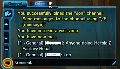 • General:そのエリア全体(惑星、インスタンス)に発言する場合。Groupメンバーを募集したり、質問したりと結構使います。